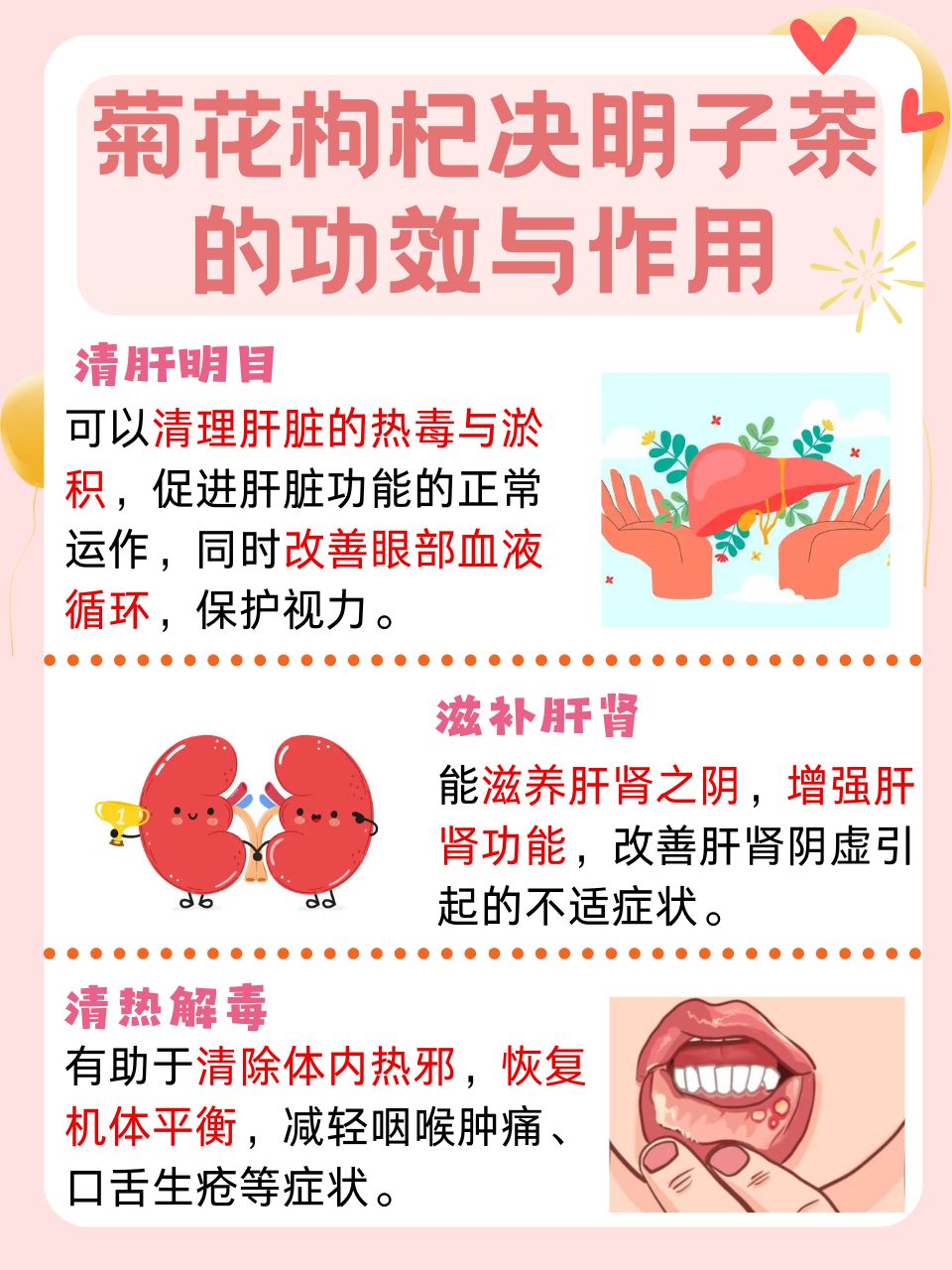 菊、クコ、カッシア種子茶の効果と機能には、通常次の点があります: 👇