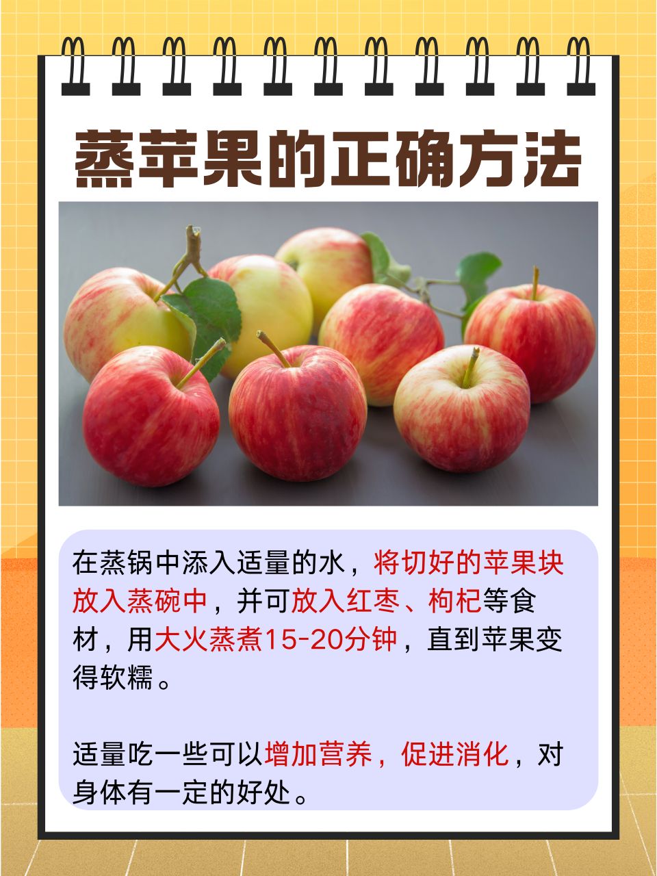 🔪調理中に空焚きしないように、蒸し器に十分な水を加えてください。切ったリンゴを蒸し器に入れます。蒸しリンゴの効果をさらに高めたい場合は、ナツメヤシやクコなどの体を温める材料を加えます。赤いナツメヤシは鉄分と複数のビタミンが豊富で、脾臓と胃を強化し、血液に栄養を与え、神経を落ち着かせる効果があり、クコは肝臓と腎臓に栄養を与え、視力を改善し、肺に潤いを与える効果があります。