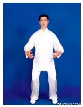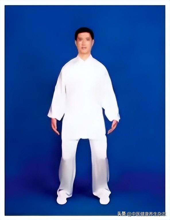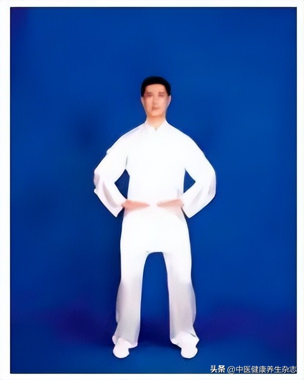 両手を重ねて下腹部の前に置き、時計回り、反時計回りの順にそれぞれ腹部を軽く3回ずつ揉みます。両手を離し、体側に戻し、左足を引き戻します。同時に正常な呼吸に戻し、呼吸と動作から注意を引き戻します。