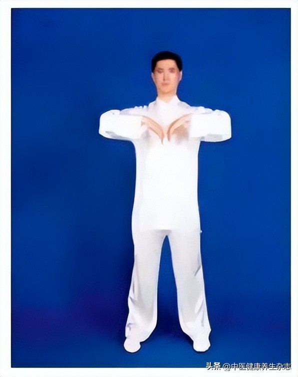 (3)両手を外側に回転させ、手のひらを内側に向け、両手を胸の前約10センチメートルの位置に戻し、立ち上がり、息を吸う。
